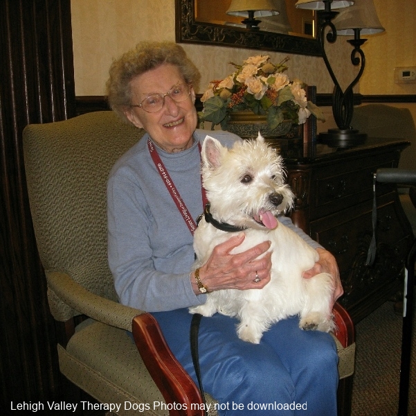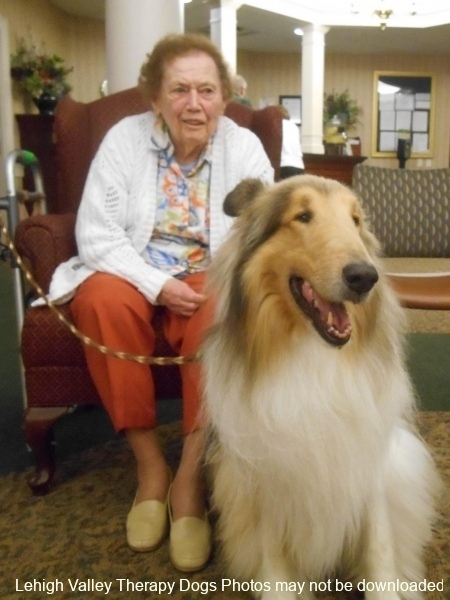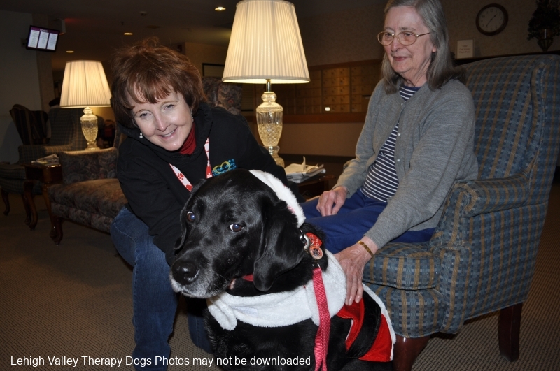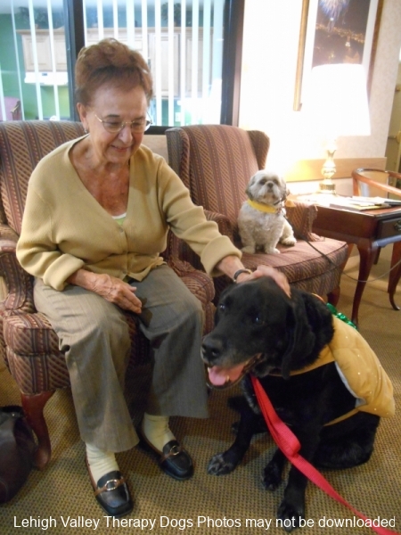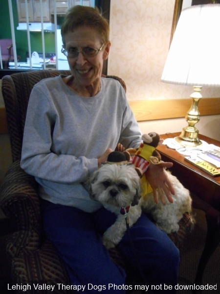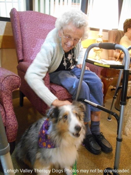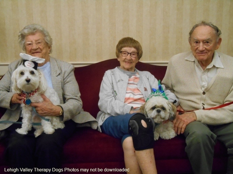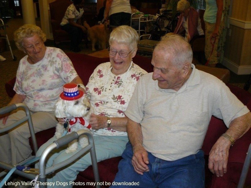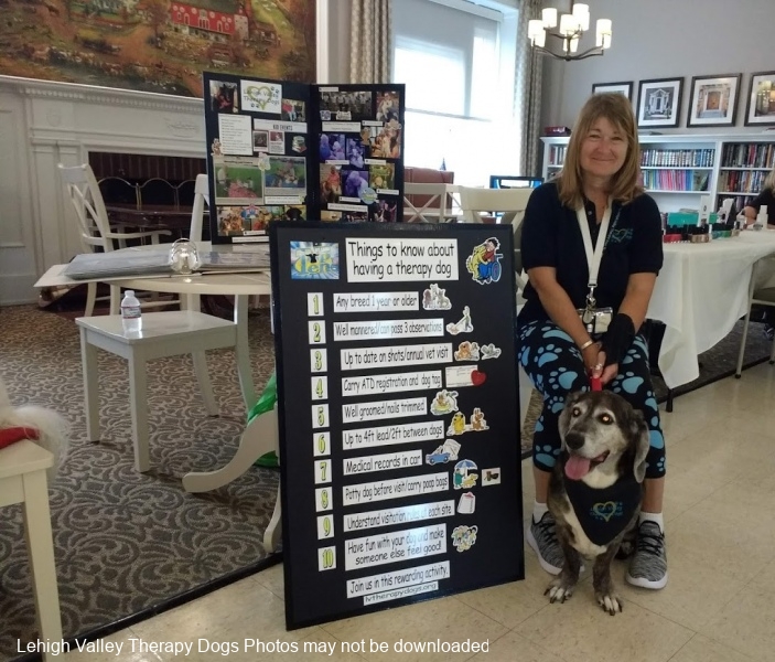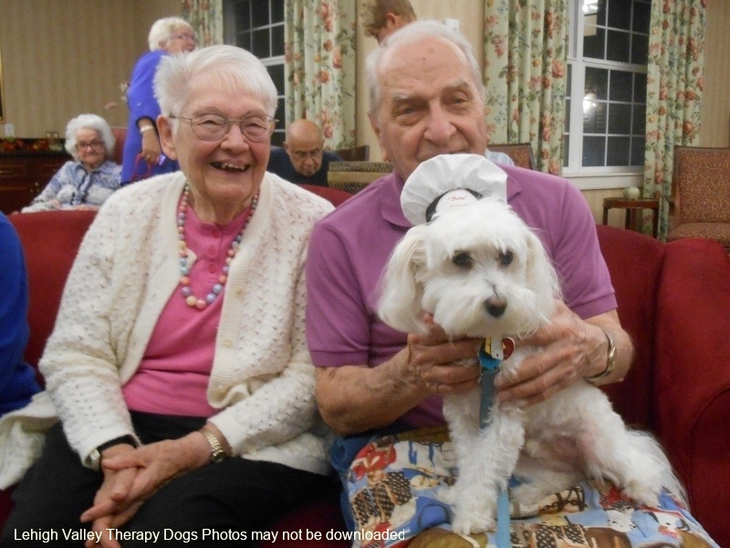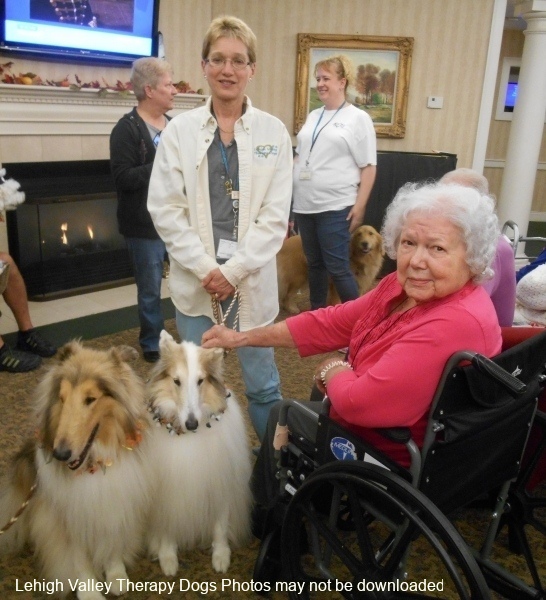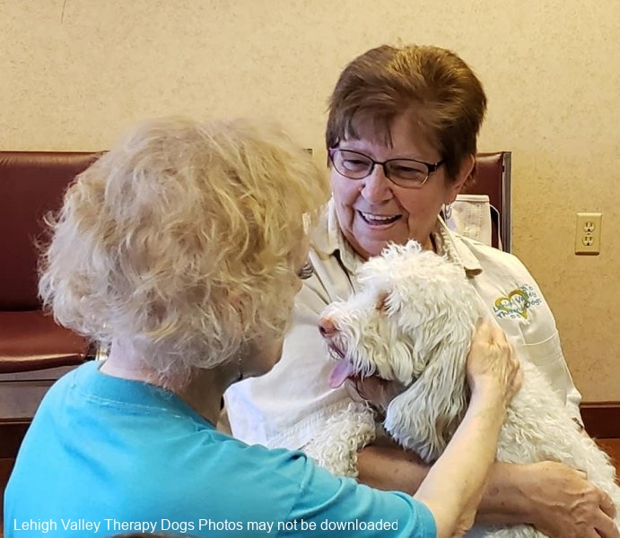 Lehigh Valley Therapy Dogs is a group of volunteers who share their certified/registered therapy dogs {which are their personal pets} with people in nursing homes, hospitals, schools and other institutions, in an effort to lift spirits. Each of our therapy dog teams have been tested and registered with Alliance of Therapy Dogs in Cheyenne Wyoming. Teams offer comfort and support to people experiencing stress, anxiety, sadness, loneliness, illness or other emotional challenges. Our members provide these visits at no cost to the individual or facility. Teams must do at least 1 visit each quarter to remain in good standing. A cold nose and soft fur are the perfect prescription for a smile. Sharing our dogs with the community brings joy and smiles not only to the individuals we visit but to the dog and handler as well.