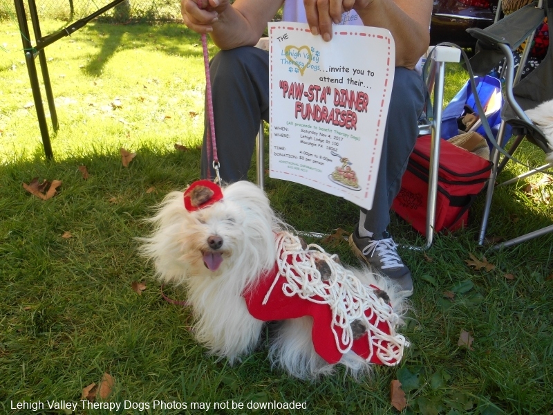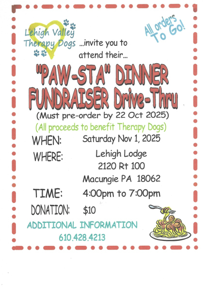 Our group does an annual fundraiser…a Drive-Thru Paw-sta Dinner on the first Saturday in November. This event is held at the Lehigh Lodge on Rt 100 in Macungie. Our members prepare a complete meal on the premises which includes a hearty serving of pasta, homemade sauce, meatballs, salad with dressing, bread and dessert. All orders for this event are submitted in advance. Don’t miss it!